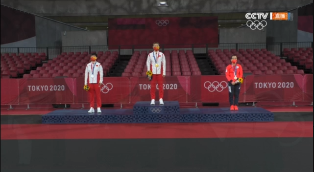 赛后颁奖典礼上,《义勇军进行曲》第15次响彻东京奥运会赛场上空,两面五星红旗缓缓升起,这也是东京奥运会赛场首次同时升起两面中国国旗。