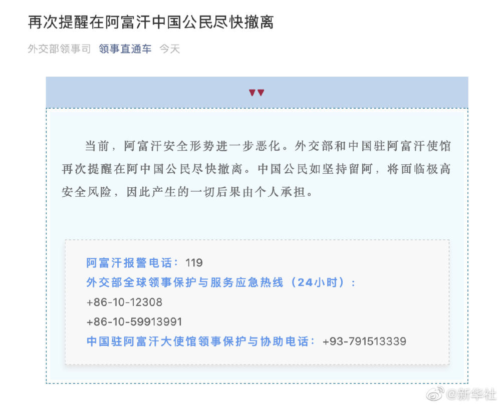 据外交部“领事直通车”微信公众号7月29日消息,当前,阿富汗安全形势进一步恶化。外交部和中国驻阿富汗使馆再次提醒在阿中国公民尽快撤离。中国公民如坚持留阿,将面临极高安全风险,因此产生的一切后果由个人承担。