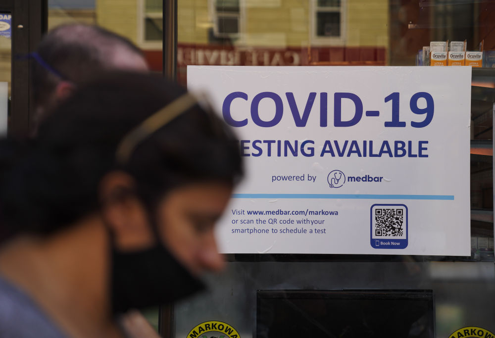 2021年7月26日,行人从美国纽约一家药店的新冠检测广告牌旁走过。(新华社记者王迎摄)