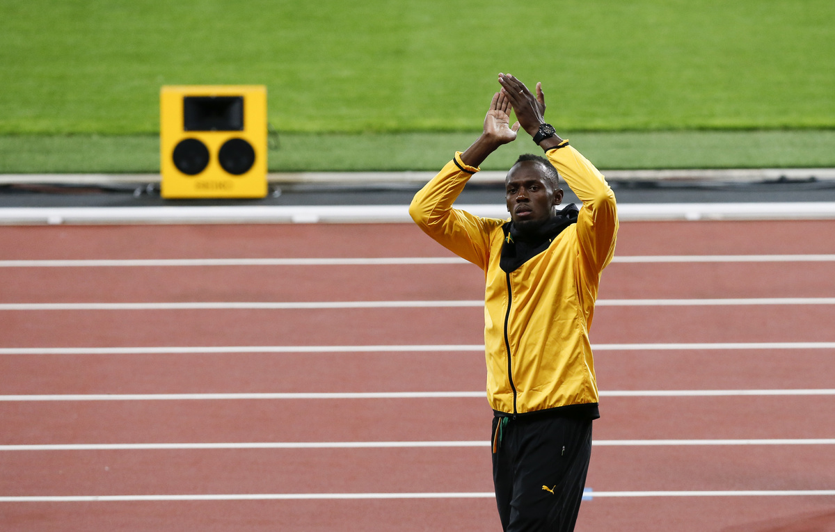 资料图:2017年8月13日,2017年国际田联世界田径锦标赛在英国伦敦落幕。在本届世锦赛结束后就退役的牙买加短跑运动员博尔特来到伦敦奥林匹克体育场,与跑道和观众挥别。新华社记者 韩岩 摄