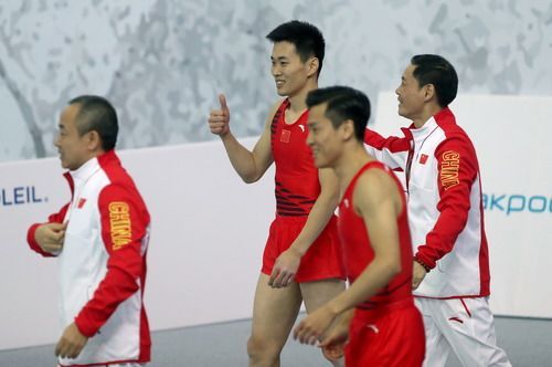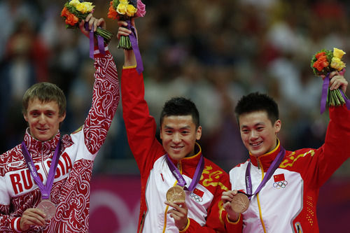 资料图:2012年8月3日,在伦敦奥运会男子蹦床决赛中,董栋(中)以62.990分的总成绩夺得冠军,乌沙科夫(左)和陆春龙(右)分获亚军和季军。新华社记者 沈伯韩 摄