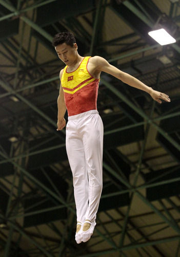 资料图:2012年4月28日,在2012年全国蹦床系列赛暨伦敦奥运会选拔赛第一站比赛中,董栋以61.850分的成绩在男子网上个人决赛中夺得冠军。新华社记者 魏培全 摄