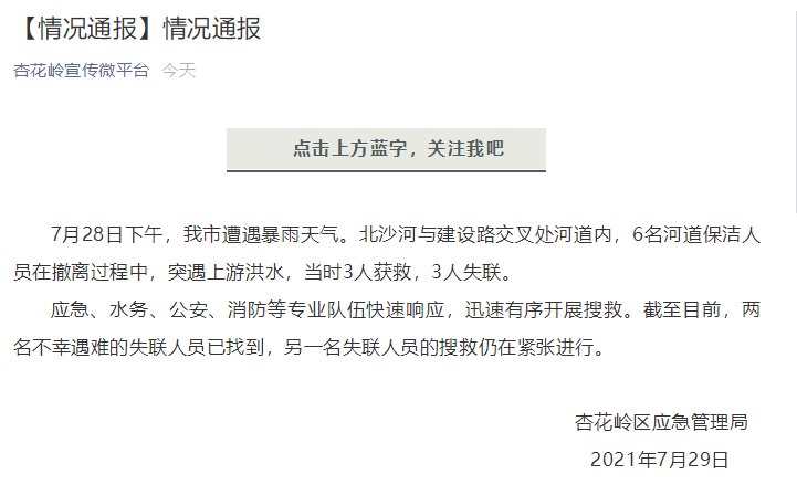 记者从太原市杏花岭区应急管理局了解到,7月28日下午,太原市遭遇暴雨天气。太原市北沙河与建设路交叉处河道内,6名河道保洁人员在撤离过程中,突遇上游洪水,当时3人获救,3人失联。