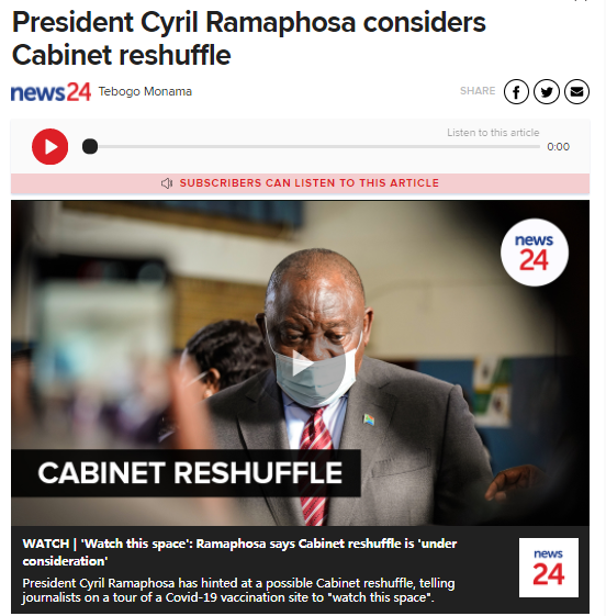 据南非媒体当地时间7月29日报道,南非总统拉马福萨当日在视察约翰内斯堡疫苗接种工作时表示,他正在考虑重组内阁。