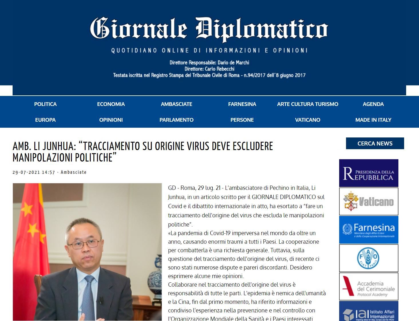 2021年7月29日,中国驻意大利大使李军华在意大利媒体《外交报》发表题为《病毒溯源必须排除政治操弄》的署名文章。全文如下:
