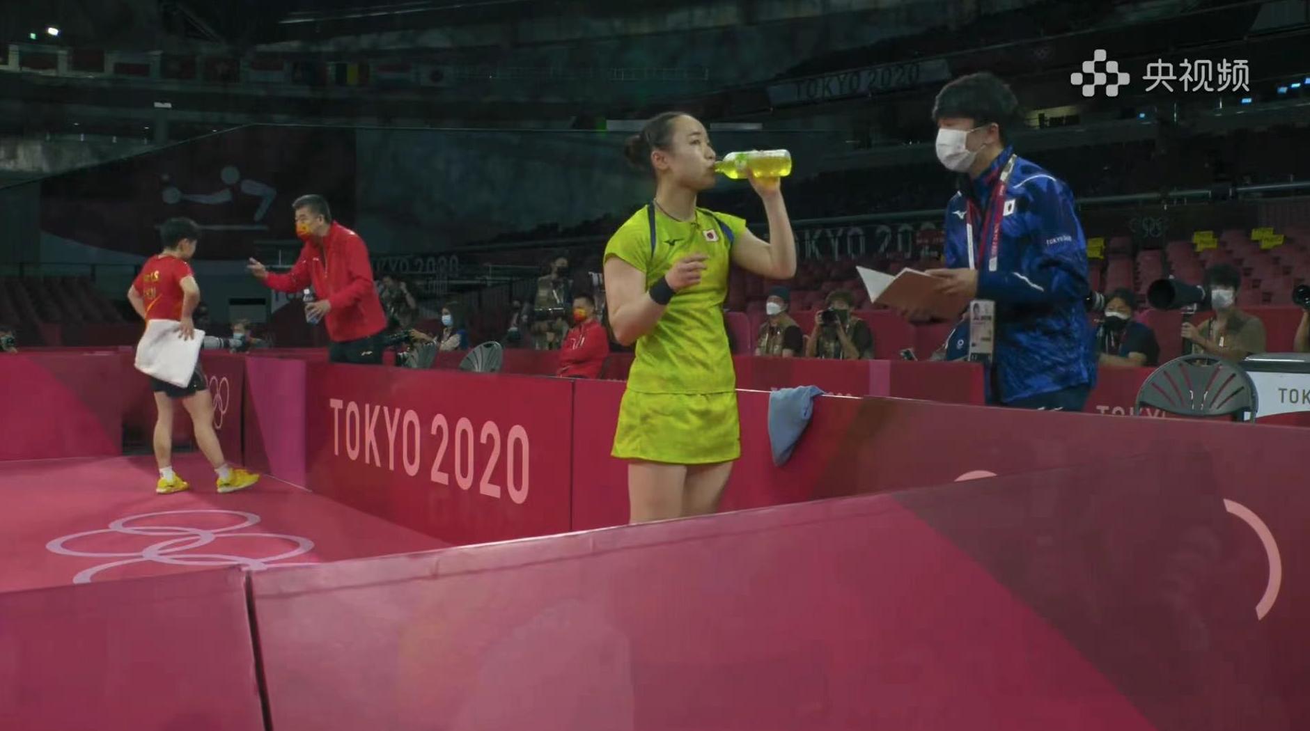 △东京奥运会乒乓球女子单打半决赛上,伊藤美诚的教练(右一)进行指导