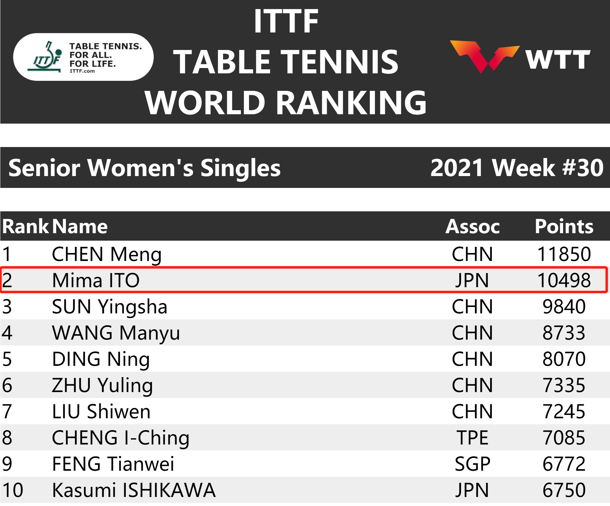 △国际乒联官网女单世界排名截图,伊藤美诚排名第二