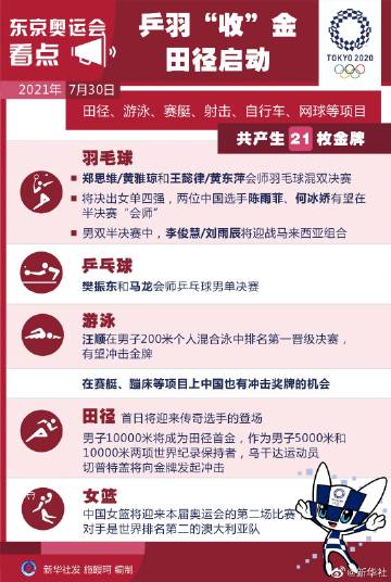 【东京奥运会今日看点:#共有48枚金牌的田径项目拉开大幕#】30日,东京奥运会将决出21枚金牌。田径比赛首日将迎来传奇选手登场,#男子10000米成田径首金#。中国选手将在羽毛球混双决赛和乒乓球男单决赛中会师,提前为中国奖牌榜添上两金两银。#中国队加油#!