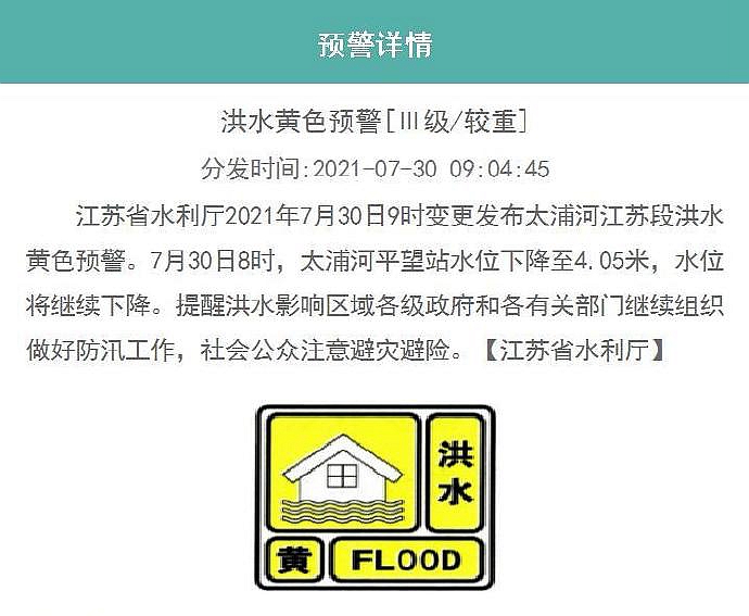 江苏省水利厅2021年7月30日9时变更发布太浦河江苏段洪水黄色预警。7月30日8时,太浦河平望站水位下降至4.05米,水位将继续下降。提醒洪水影响区域各级政府和各有关部门继续组织做好防汛工作,社会公众注意避灾避险。