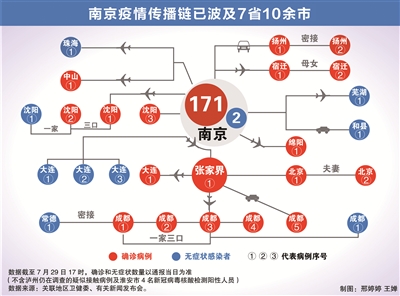 图为南京疫情传播链。数据截至7月29日17时,确诊和无症状数量以当地最新通报为准(不含泸州仍在调查的疑似接触病例及淮安市4名新冠病毒核酸检测阳性人员)。 数据来源:关联地区卫健委、有关新闻发布会。 (制图:邢婷婷 王婵)