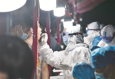 7月28日晚,张家界市全城搭建6个新冠肺炎检测点,图为7月29日凌晨2点,市民正在张家界市崇实南校检测点有序接受核酸检测。邵颖 摄