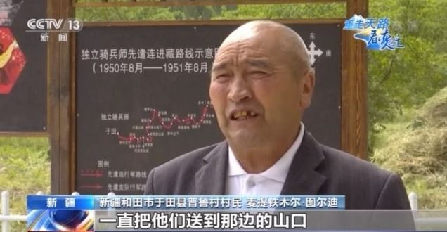 新疆和田市于田县普鲁村村民 麦提铁木尔·图尔迪:当时战士们斗志昂扬,他们围着红旗高呼前进、前进。我们普鲁村的村民一直把他们送到那边的山口。
