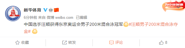 中国选手汪顺获得东京奥运会男子200米混合泳冠军。