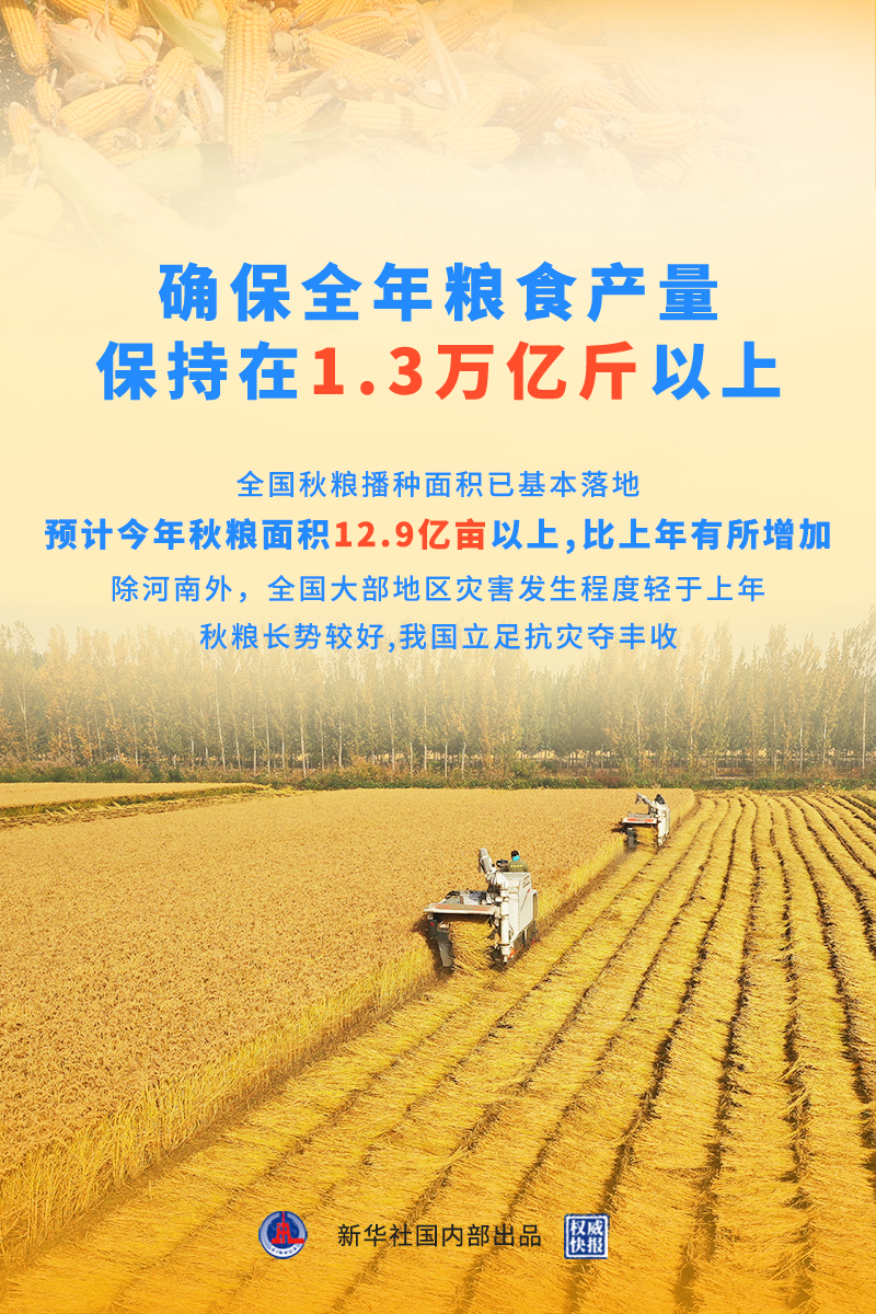 农业农村部将立足抗灾夺丰收,狠抓秋粮田间管理、防灾减灾和病虫防控,确保全年粮食产量保持在1.3万亿斤以上。