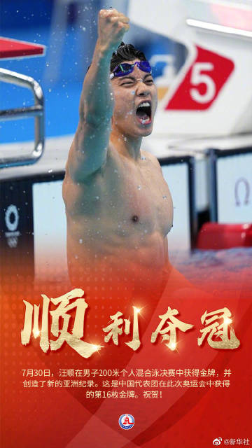 【惊喜不断!“顺”利夺冠!】在刚刚结束的东京奥运会男子200米混合泳决赛中,#汪顺游出中国气势#,打破亚洲纪录夺冠,为中国游泳队再添一金!祝贺@汪順Steve !#中国第16金##中国队加油#