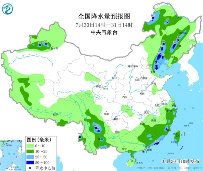 另外,今天早晨8时至明天早晨8时,河北东北部、内蒙古东南部和东北部、辽宁西部和北部、吉林西部、黑龙江中部偏南等地的部分地区有大到暴雨,其中,辽宁西部等地的局部地区有大暴雨。