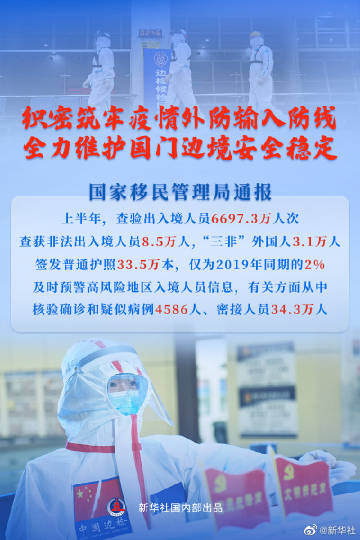 【国家移民管理局:#坚决防止疫情通过出入境渠道传播#】当前境外疫情反弹明显,我国外防输入面临严峻形势。记者了解到,国家移民管理局将密切关注全球疫情走势,持续动态调整政策措施,进一步织密筑牢外防输入防线,全力维护国门边境安全稳定,坚决防止疫情通过出入境渠道传播。国家移民管理局30日举行新闻发布会通报,上半年查验出入境人员6697.3万人次,出入境交通运输工具752.7万辆(架、艘)次;查获非法出入境人员8.5万人,“三非”外国人3.1万人;严格审批签发出入境通行证件,全国共签发普通护照33.5万本,主要事由为出国留学、就业和商务,签发量仅为2019年同期的2%;及时预警高风险地区入境人员信息,有关方面从中核验确诊和疑似病例4586人、密接人员34.3万人;强化与毗邻国家涉疫信息共享,和有关各方一共通报涉疫信息2200余份,堵截劝返抵边可疑人员3000多人。(记者任沁沁,海报设计杨轶群)
