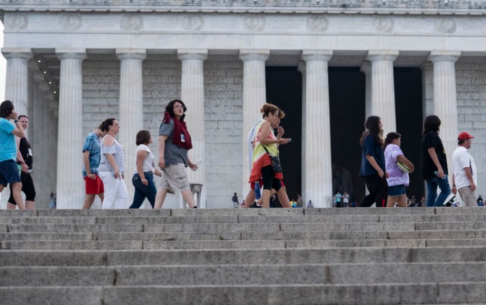 7月7日,人们在美国首都华盛顿的林肯纪念堂附近游览。(新华社记者刘杰摄)