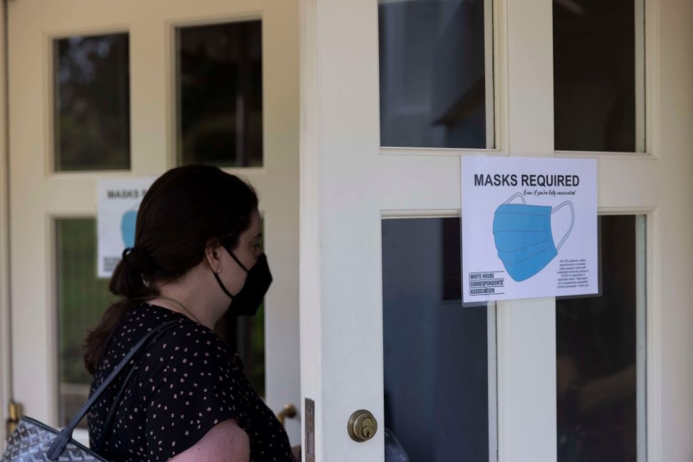 7月28日,在美国华盛顿白宫,新闻简报室门口张贴着要求戴口罩的标识。(新华社发,沈霆摄)
