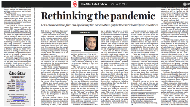 7月29日,南非茨瓦内理工大学教授兼英国牛津大学技术、管理和发展中心高级研究员马莫·穆奇也在南非当地媒体《星报》《比陀新闻报》等报纸发表题为《对新冠疫情的反思》的评论文章。文章肯定了世界多国特别是中国在抗击新冠疫情中取得的突出成就,指出了全球抗疫中存在的诸多问题与挑战,并提出坚持病毒溯源是一个科学问题,反对将其政治化、污名化及意识形态化,反对“疫苗民族主义”。(总台记者 曲晟)