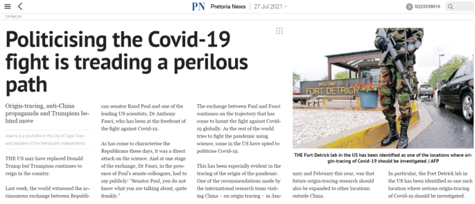 7月27日,南非民主独立党主席、开普敦市议员安瓦尔·亚当斯在当地媒体《星报》《比陀新闻报》《开普时报》《水星报》及独立传媒网站发表题为《政治化行径对国际抗疫合作有百害而无一利》的评论文章。文章批评美国部分人士将病毒溯源政治化,并认为世卫组织应考虑对美国德特里克堡生物实验室进行调查。