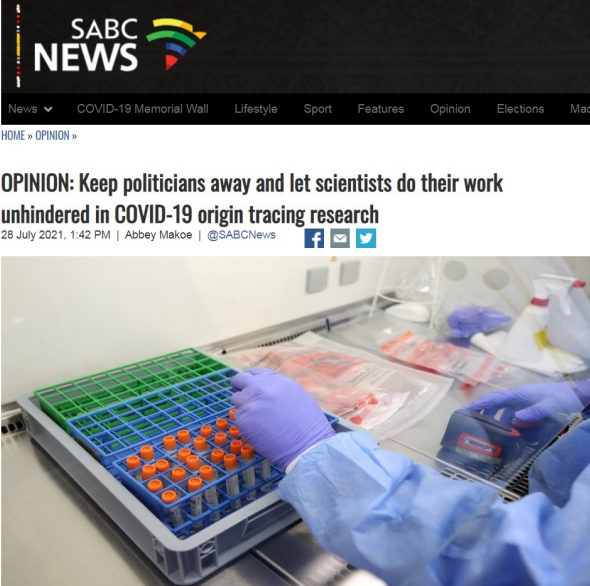 7月28日,南非国家电视台网站刊登前政治主编马库伊评论文章,要求西方政客停止干预病毒溯源,应该让科学家不受阻碍地进行溯源研究。马库伊表示,疫情仍在蔓延,人们迫切希望一些政客,尤其是华盛顿的政客,能够允许世界卫生组织不受阻碍地继续工作。