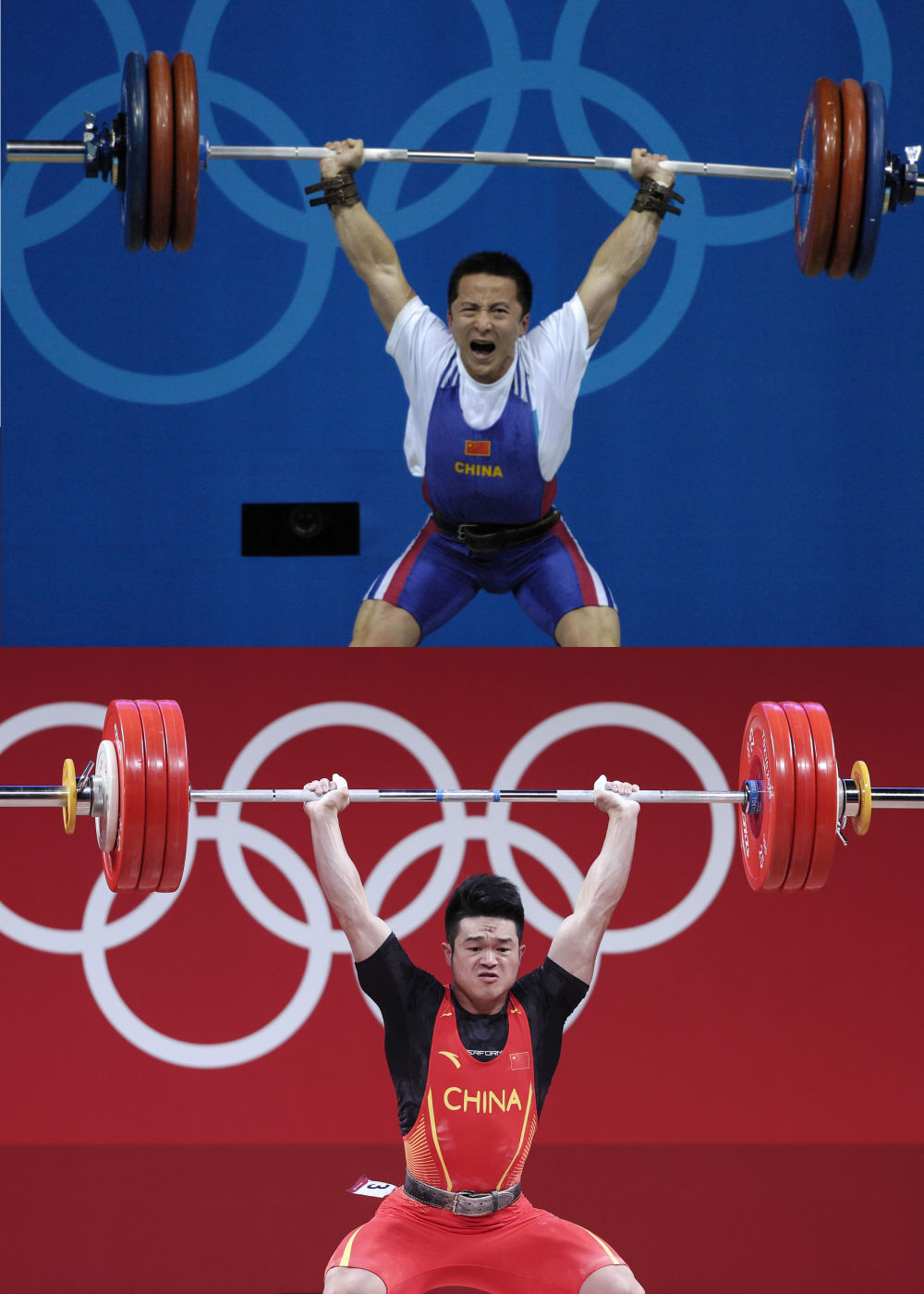 ↑拼版照片:上图为2004年8月16日,中国选手石智勇在雅典奥运会举重男子62公斤级比赛中获得金牌。下图为2021年7月28日,中国选手石智勇在东京奥运会举重男子73公斤级决赛中夺冠。 新华社记者 杨磊 摄