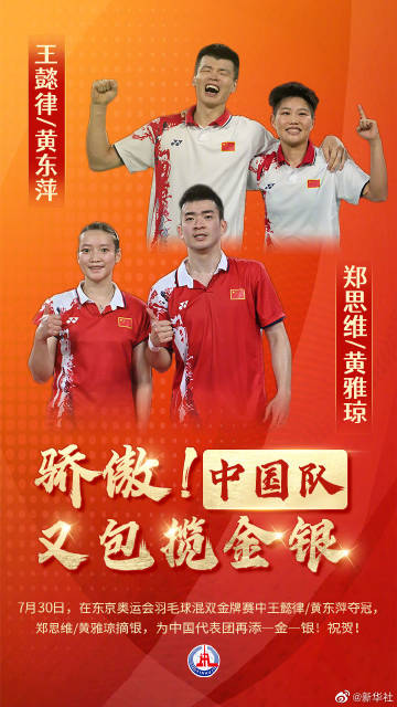 【骄傲!#距离中国队上次包揽金银不到80分钟#!】在刚刚结束的东京奥运会羽毛球混双决赛中,两组中国选手王懿律/黄东萍和郑思维/黄雅琼顶峰相遇,为中国队再添一金一银!#恭喜中国队又包揽冠亚军# 网友表示,又是一场观感极其舒适的羽毛球高水平视觉盛宴,#果然队内冠军比世界冠军还难#!