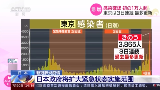 根据日本广播协会电视台的统计,29日,日本国内新增新冠肺炎确诊病例首次过万,达10699例。当天,东京都单日新增病例达3865例,再次达到新高。目前,日本累计确诊病例达903324例。