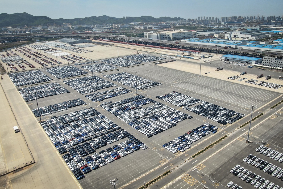 在大连港大连汽车码头有限公司港口停车场的新车(无人机照片)。新华社记者 潘昱龙 摄