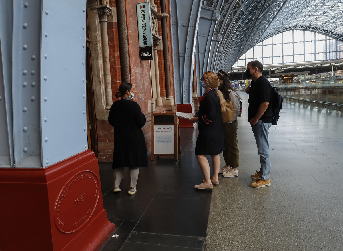 2021年7月29日,旅客在英国伦敦圣潘克拉斯国际火车站内的一家新冠病毒检测中心外排队。(新华社记者韩岩摄)