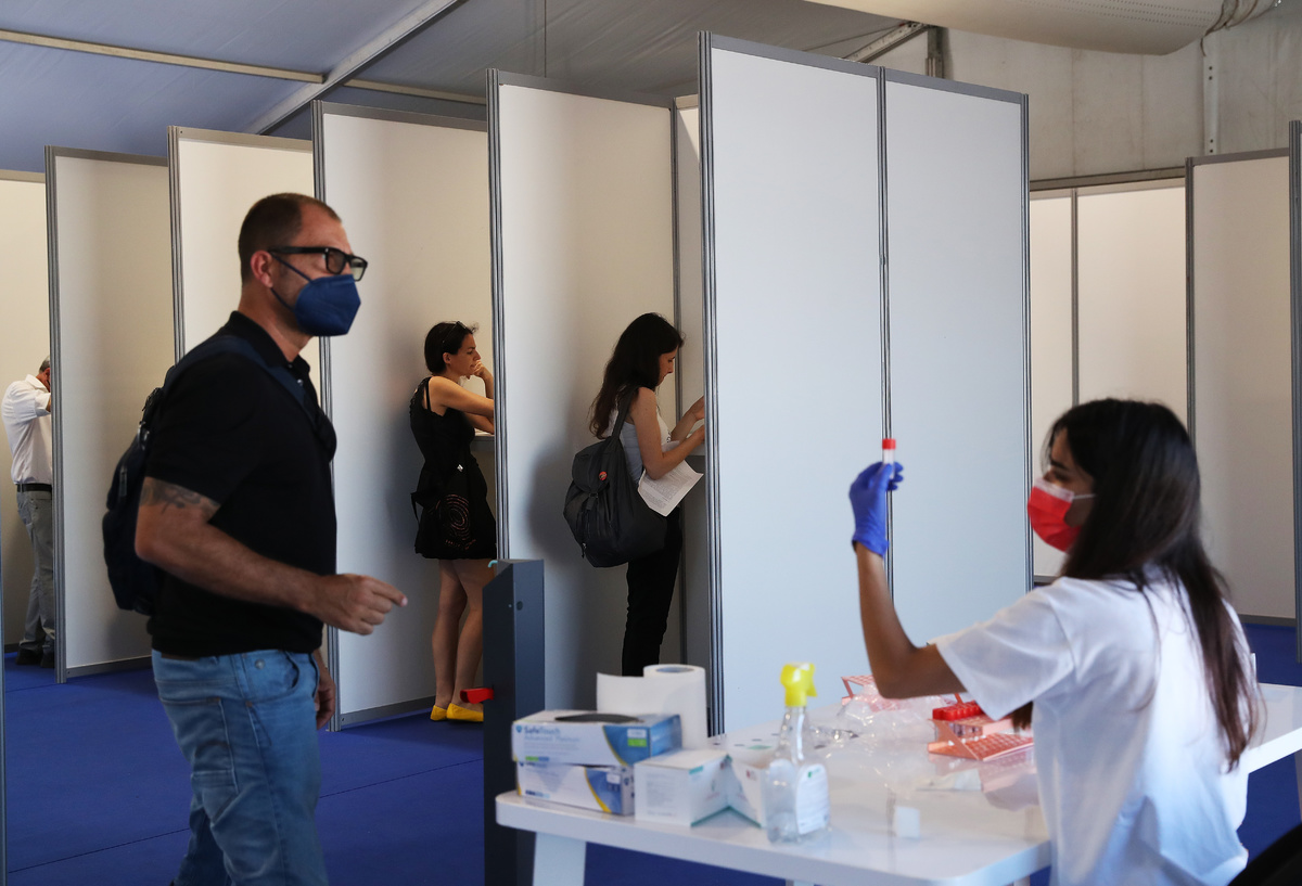 2021年7月5日,在法国戛纳为电影节注册人员设立的新冠病毒检测点,工作人员收集检测样本。(新华社记者高静摄)