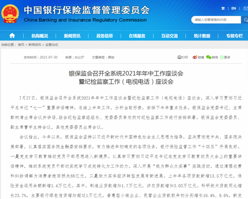 记者30日从银保监会获悉,银保监会日前召开全系统2021年年中工作座谈会暨纪检监察工作(电视电话)座谈会,强调要毫不松懈地防范化解金融风险,加快高风险机构处置,加大对违法违规股东惩处力度,积极应对不良资产集中反弹,严防高风险影子银行死灰复燃,防止银行保险资金绕道违规流入房地产市场等。详情>>>