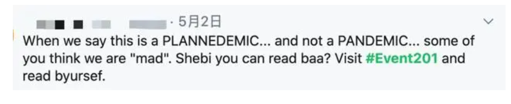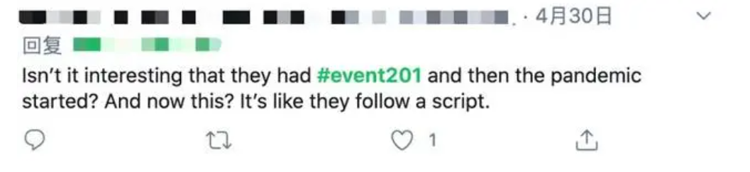 还有人留言说:“当我们说这是一个计划,而不是大流行时,有些人会认为我们‘疯了’;你们可以去仔细看看‘事件201’。”