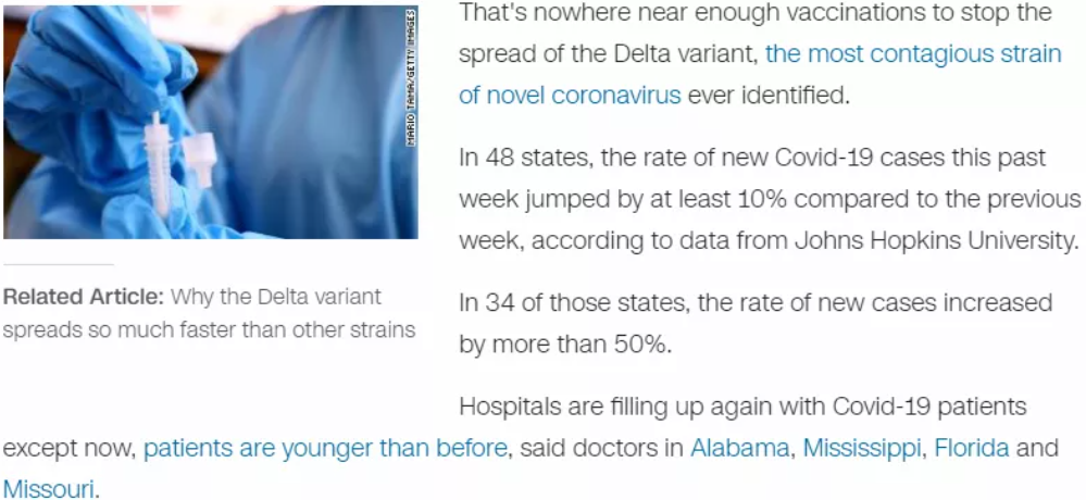 根据美国约翰斯·霍普金斯大学数据,截至美东时间29日17时21分,美国新冠肺炎确诊病例已超过3472万,累计病亡超61万人。据美国有线电视新闻网27日报道,近期美国多州疫情反弹严重,感染病例和住院病例增幅几乎都在上升,病例还呈现出年轻化趋势。