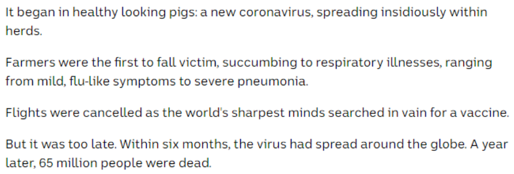 演习中,感染病毒的一部分患者表现为轻度流感,另一些患者则发展为严重的呼吸道疾病,最终导致肺炎。随后,感染在世界范围内呈扇形蔓延,人口密集和贫困地区的情况尤其糟糕。
