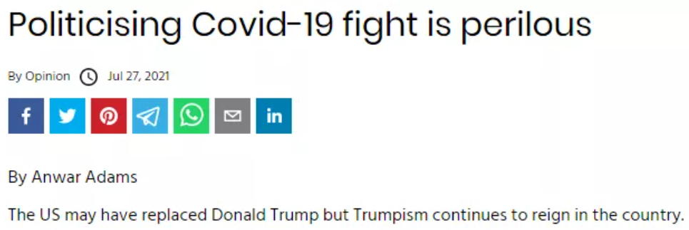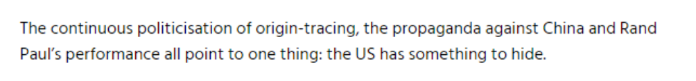 亚当斯在文章中说,美国不停地推动病毒溯源政治化、开展对华舆论攻击,指向一个共同事实,那就是“美国有事向世界隐瞒”。