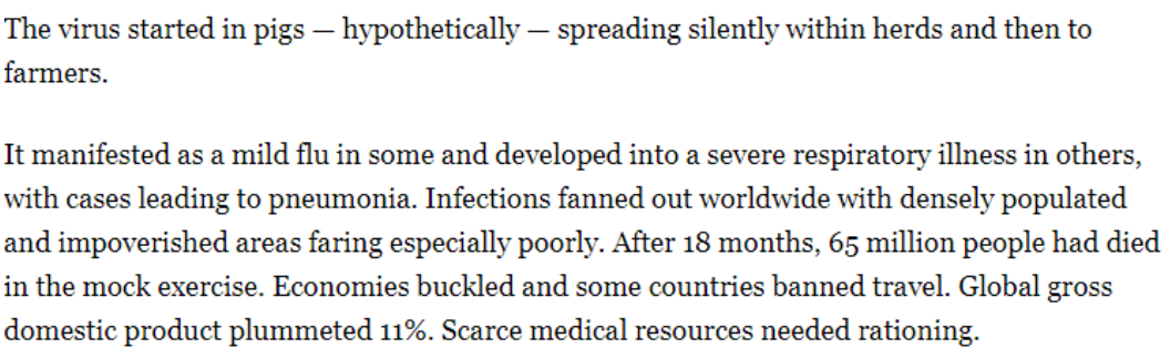 演习推演还包括:最初几个月里确诊病例数每周增加一倍,病毒暴发的第一年没有研发出可用疫苗,到第18个月的时候将有6500万人死亡。演习结果表明,该病毒只需要6个月就能在全球传播。这场与后来的新冠肺炎疫情现实吻合度超高的演习内容还扩展到社会生活的各个层面,包括疫情扩散之下,各国之间停航、实施边境管制,旅游业受重创,在社交网络上引发恐慌情绪蔓延,与此同时,疫情将触发全球性的金融危机,各地股市暴跌......