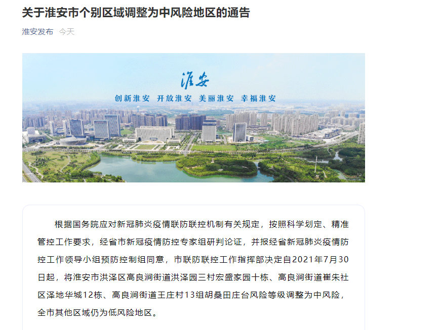 据淮安发布微信公众号消息,7月30日,根据国务院应对新冠肺炎疫情联防联控机制有关规定,按照科学划定、精准管控工作要求,经省市新冠疫情防控专家组研判论证,并报经省新冠肺炎疫情防控工作领导小组预防控制组同意,市联防联控工作指挥部决定自2021年7月30日起,将淮安市洪泽区高良涧街道洪泽园三村宏盛家园十栋、高良涧街道崔朱社区泽地华城12栋、高良涧街道王庄村13组胡桑田庄台风险等级调整为中风险,全市其他区域仍为低风险地区。