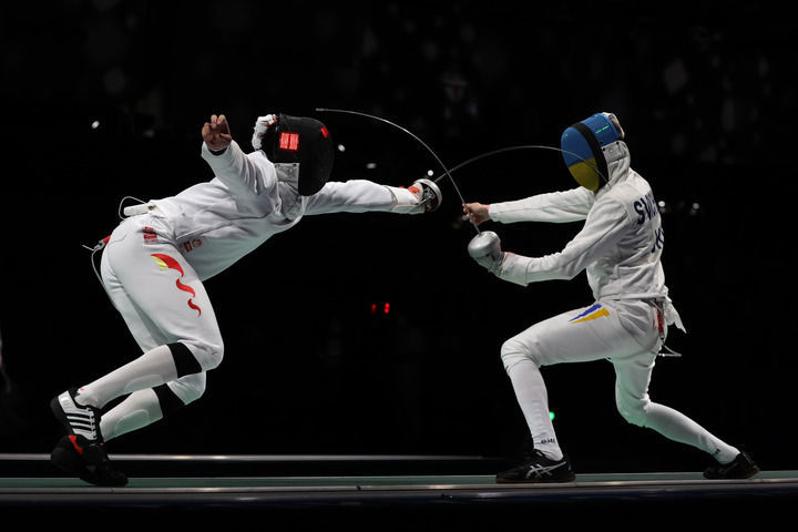 7月30日,中国队选手王子杰(左)在比赛中对阵乌克兰队选手罗曼。当天,在东京奥运会击剑项目男子重剑团体四分之一决赛中,中国队战胜乌克兰队晋级半决赛。新华社记者 郑焕松 摄