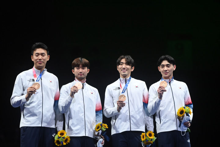 7月30日,韩国选手在男子重剑团体击剑决赛的颁奖仪式。新华社记者 张宏祥 摄