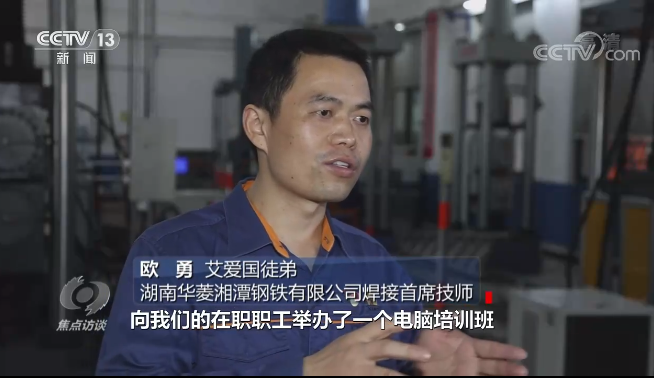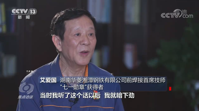 湖南华菱湘潭钢铁有限公司前焊接首席技师 “七一勋章”获得者 艾爱国:当时我的师傅说了一句话“你是属于中上等的。”当时听了这句话以后,我就暗暗下劲,每天晚上练到很晚。焊工经常是一身伤,血泡、烫伤,火花、熔液沾到身上,但是我一直没有放弃过,因为太渴望把这门手艺学好。