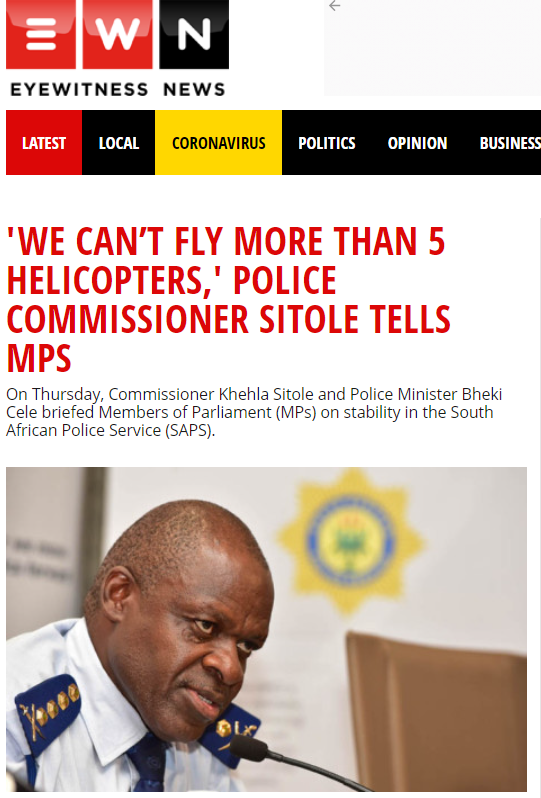 赫拉·西托莱称,近年来南非警方的经费接连遭到削减,连续几年已减少150亿兰特(约66亿元人民币),目前很多设备因得不到维护,状态很差。2010年南非警方还有14架警用直升机,但目前只有5架可以起飞。
