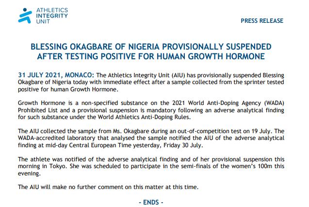 据声明称,于7月30日赢得女子100米预赛第一名的尼日利亚女短跑运动员布莱森·奥卡巴雷于7月19日提交的检测样本的生长激素检测结果呈阳性,因此对其发出停赛通知。