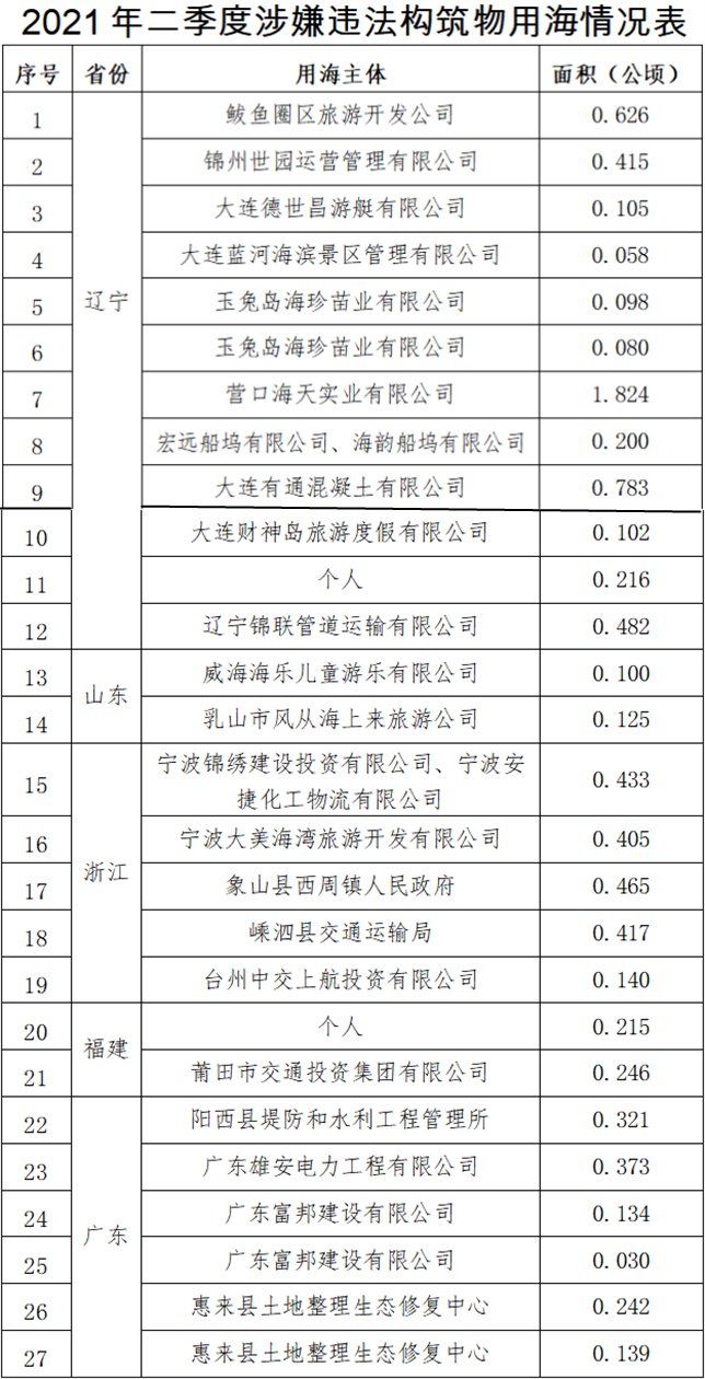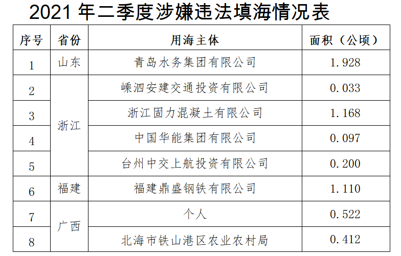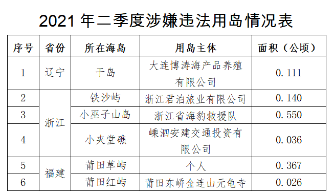 第二季度发现并制止涉嫌违法填海8处,涉及海域面积约5.47公顷。其中,山东省1处,涉及海域面积约1.93公顷;浙江省4处,涉及海域面积约1.50公顷;福建省1处,涉及海域面积约1.11公顷;广西壮族自治区2处,涉及海域面积约0.93公顷。发现并制止跨海桥梁、码头、堤坝等涉嫌违法构筑物用海27处,涉及海域面积约8.77公顷。其中,辽宁省12处,涉及海域面积约4.99公顷;山东省2处,涉及海域面积约0.22公顷;浙江省5处,涉及海域面积约1.86公顷;福建省2处,涉及海域面积约0.46公顷;广东省6处,涉及海域面积约1.24公顷。发现并制止涉嫌违法用岛6处,面积约1.23公顷。其中,辽宁省1处,面积约0.11公顷;浙江省3处,面积约0.73公顷;福建省2处,面积约0.39公顷。上述违法用海用岛均已移交有关执法机关依法进行查处。