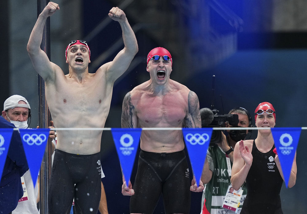 4×100米男女混合泳接力是东京奥运会游泳新增项目,英国队在预赛中游出了3分38秒75的成绩,只比中国队的世界纪录慢了0.34秒。决赛中,英国队继续表现神勇,以3分37秒58的成绩摘得金牌,并打破了由中国队保持的世界纪录。徐嘉余、闫子贝、张雨霏和杨浚瑄组成的中国队屈居亚军,澳大利亚队排名第三。东京奥运会100米蛙泳金牌得主雅各比在比赛中遭遇泳镜脱落的意外,世锦赛冠军美国队最终排名第五。
