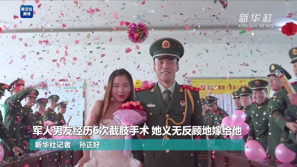 【她义无反顾地#嫁给经历6次截肢手术的军人男友#】军人男友先后经历4次病危,6次截肢手术,捡回一条命的同时,却永远失去了半条腿。尽管相处时间还不长,但她没有选择离开,而是选择与男友一起战胜病魔。在她的鼓励下,男友装上假肢重回军营,她也义无反顾地披上婚纱,成长为“最美军嫂”。“八一”来临之际,我们讲述他们的爱情故事。(记者 孙正好) 新华社的微博视频