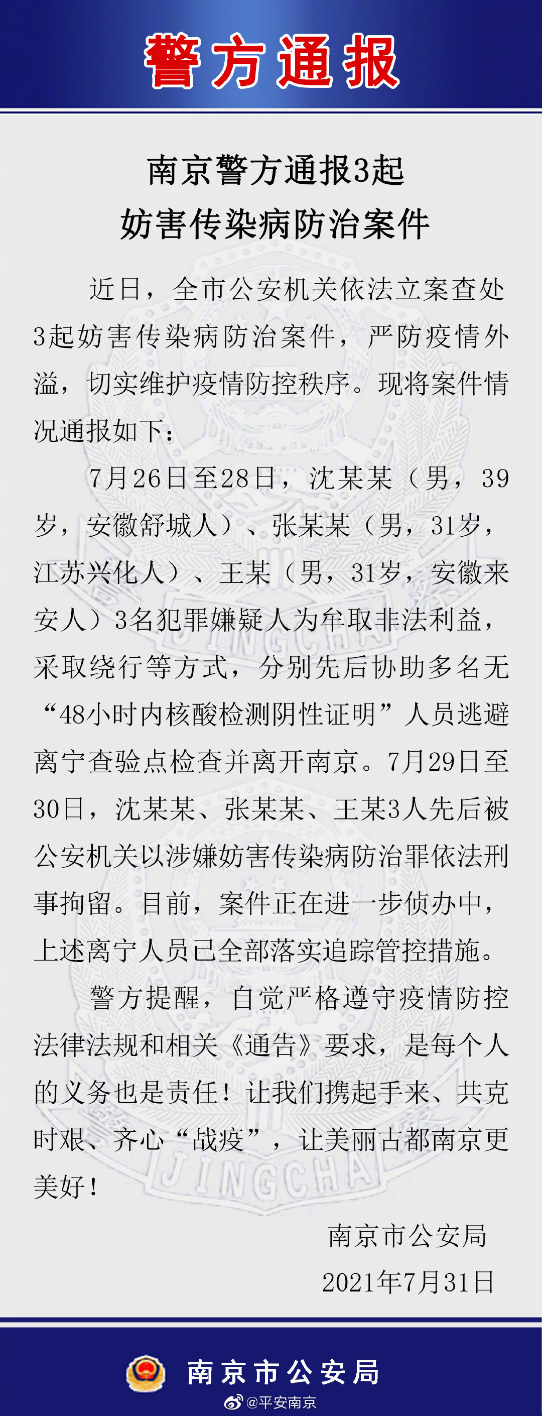 协助多名无核酸阴性证明人员逃避查验离开南京,3人被刑拘