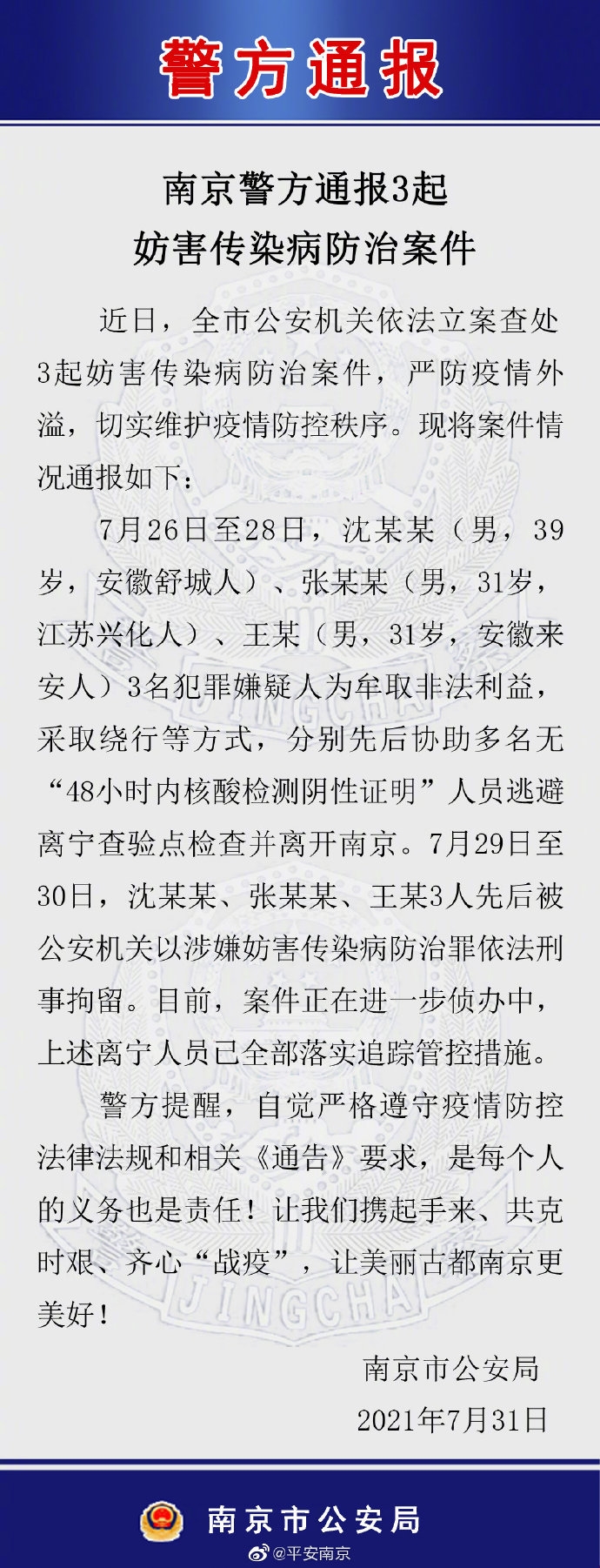 央视网消息:据“平安南京”微博消息,7月26日至28日,沈某某(男,39岁,安徽舒城人)、张某某(男,31岁,江苏兴化人)、王某(男,31岁,安徽来安人)3名犯罪嫌疑人为牟取非法利益,采取绕行等方式,分别先后协助多名无“48小时内核酸检测阴性证明”人员逃避离宁查验点检查并离开南京。7月29日至30日,沈某某、张某某、王某3人先后被公安机关以涉嫌妨害传染病防治罪依法刑事拘留。目前,案件正在进一步侦办中,上述离宁人员已全部落实追踪管控措施。