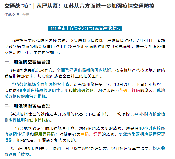 据“江苏交通”微信公众号消息,为严格落实疫情防控各项措施,坚决遏制疫情传播,严防疫情扩散,7月31日,江苏省新型冠状病毒感染肺炎疫情防控工作领导小组交通防控组发出紧急通知,进一步加强疫情交通防控工作,主要内容如下: